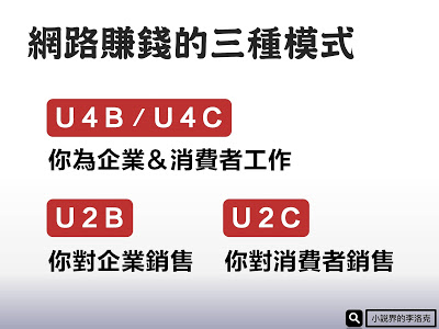 【向網友與企業收錢】 網路個體戶靠價值賺錢,而賺錢花樣感覺很多,但模式其實只有三種。 1. U4B/U4C(你為企業&消費者工作) 2. U2B(你對企業銷售) 3. U2C(你對消費者銷售) B是Business(企業);C是Customer(消費者);那U呢?U就是you,也就是你啦! 4則是for的諧音,2則是to的諧音。 【U4B/U4C】...