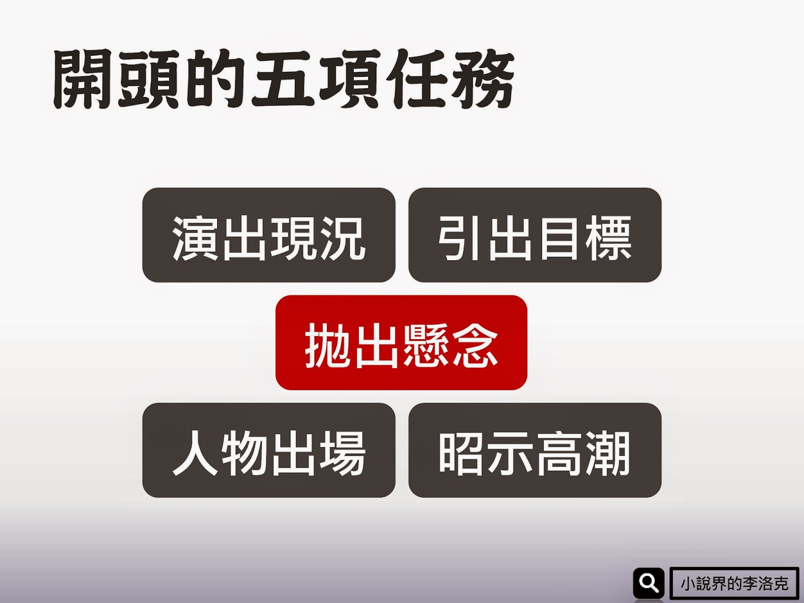 所以三幕劇能流傳兩千年自然有它的道理,洛克在創作故事之時,一開始也會先用三幕階段拉出故事的大主線,接著才去填滿各項細節(目標、動力、阻礙等)。